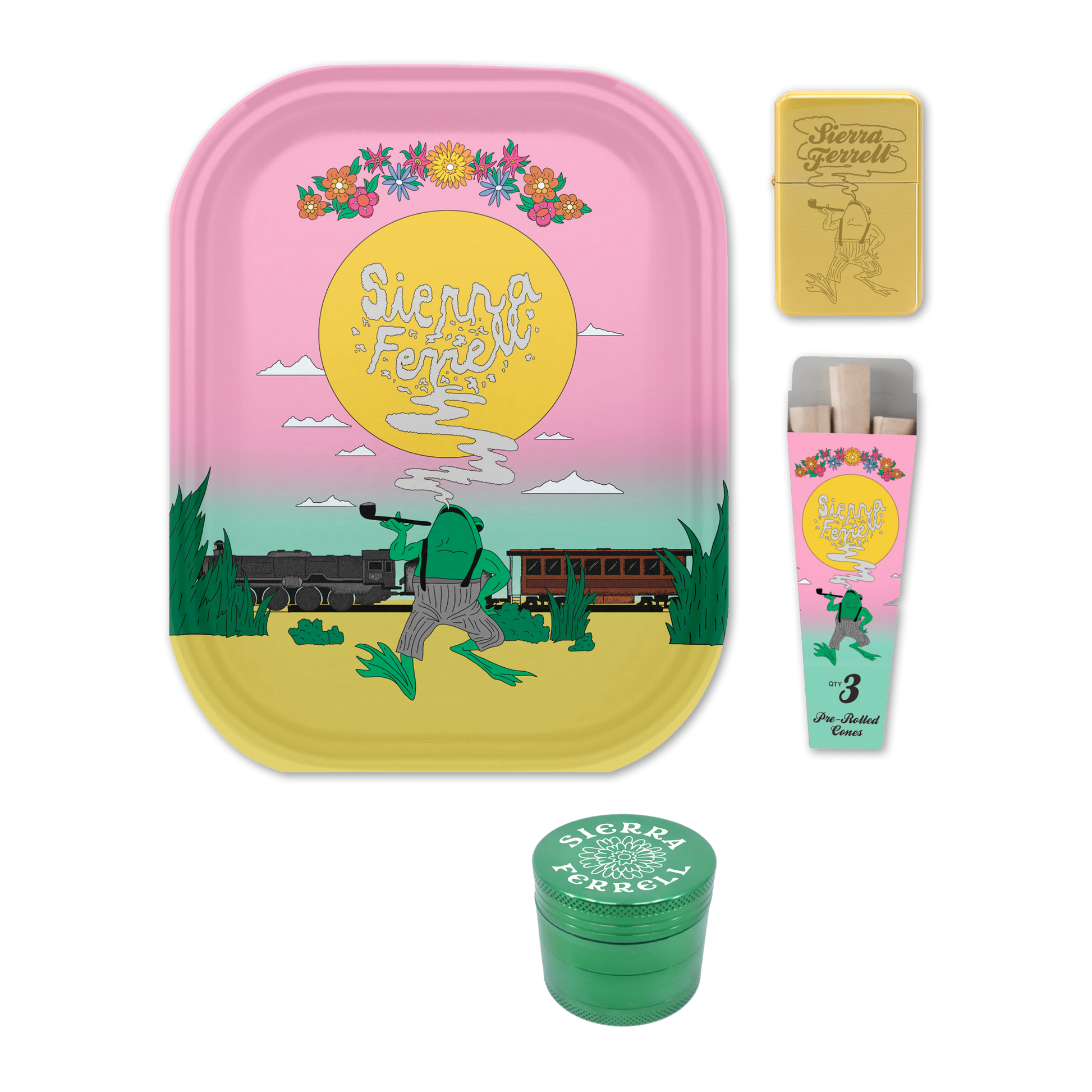- This bundle contains a grinder, lighter (no fluid), 3-cone set and rolling tray.